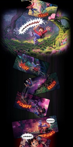 Auf den infinite canvas bin ich damals durch Scott McCloud aufmerksam geworden. Es gab auf seiner Website ein Beispiel für den canvas, in dem ein Astronaut aus einem explodierenden Raumschiff fällt. Das hat mich stark beeindruckt. Die Szene aus Kapitel 3, in der Jonas durch den Großen Wald fällt, spielt auf dieses Vorbild an.
